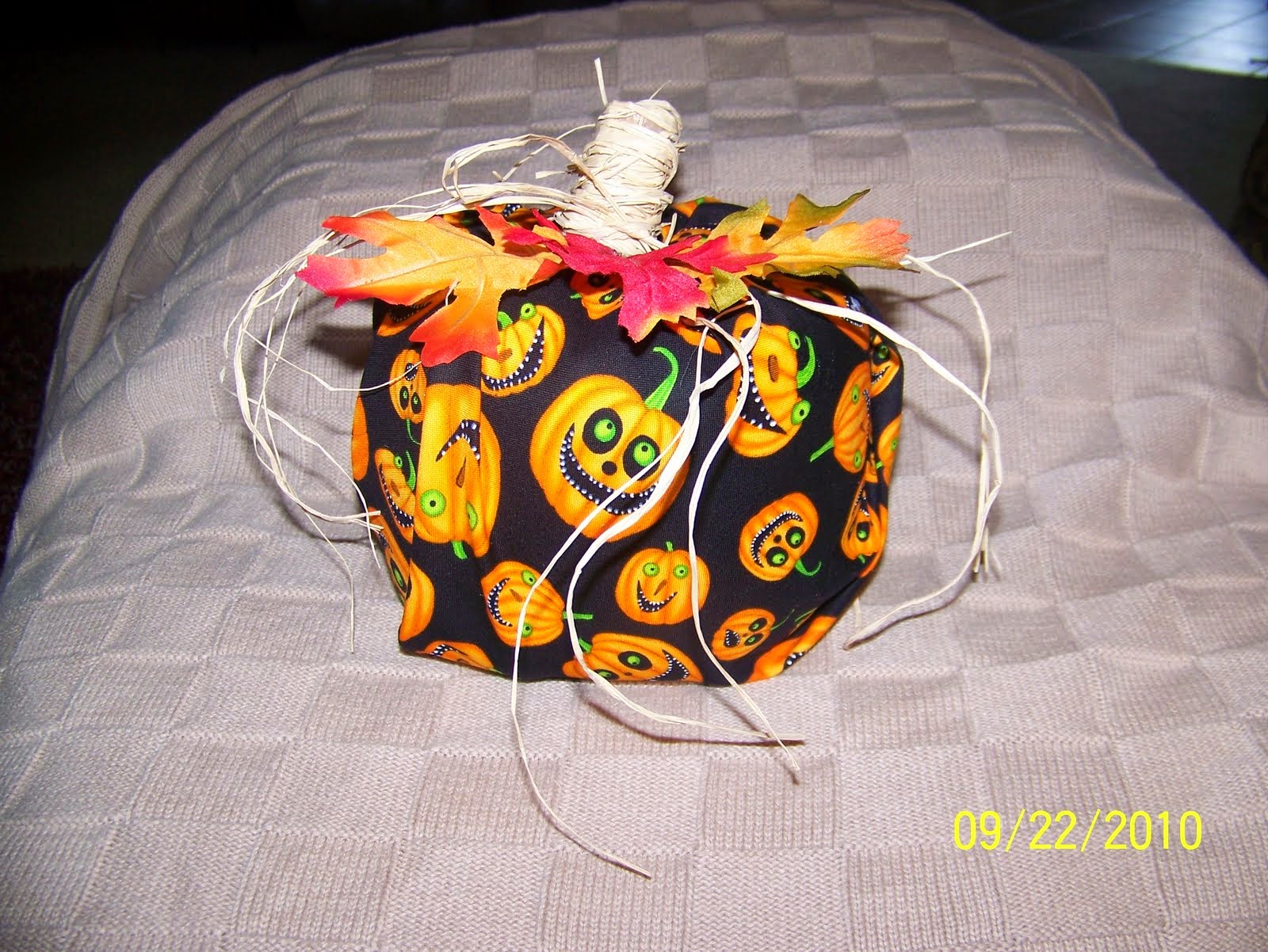 I simply cut a chunk of quilt batting to the same size as the fat quarter (which is 18"x21", I think). From there you set the toilet paper roll in the middle of the batting, then start tucking the batting into the hole at the top of the roll. Do the same thing with the fabric. It starts shaping up and looking like a pumpkin pretty quick! When all that's done, roll up a lunch bag, wrap some raffia around it, and poke it down the hole at the top of the pumpkin. You'll have to glue it down here and there (you'll know . . . when it starts falling apart, GLUE!).